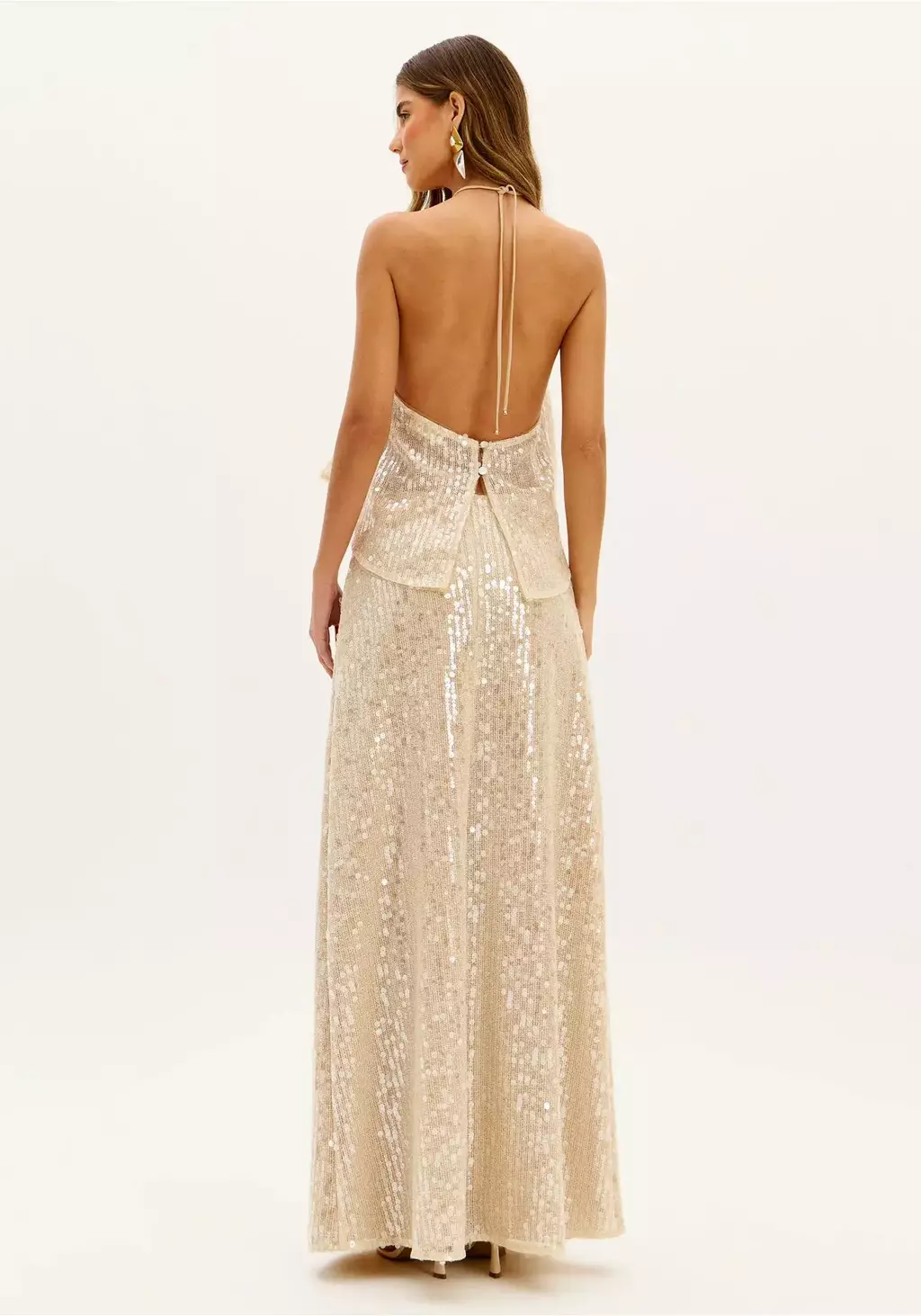 a saia midi é desejo absoluto. Com modelagem evasê e cintura alta, é toda em paetês que adicionam destaque e estilo. Seu caimento leve valoriza o movimento, enquanto o fechamento por zíper garante o ajuste perfeito. Ideal para combinações glam, do jantar à festa.