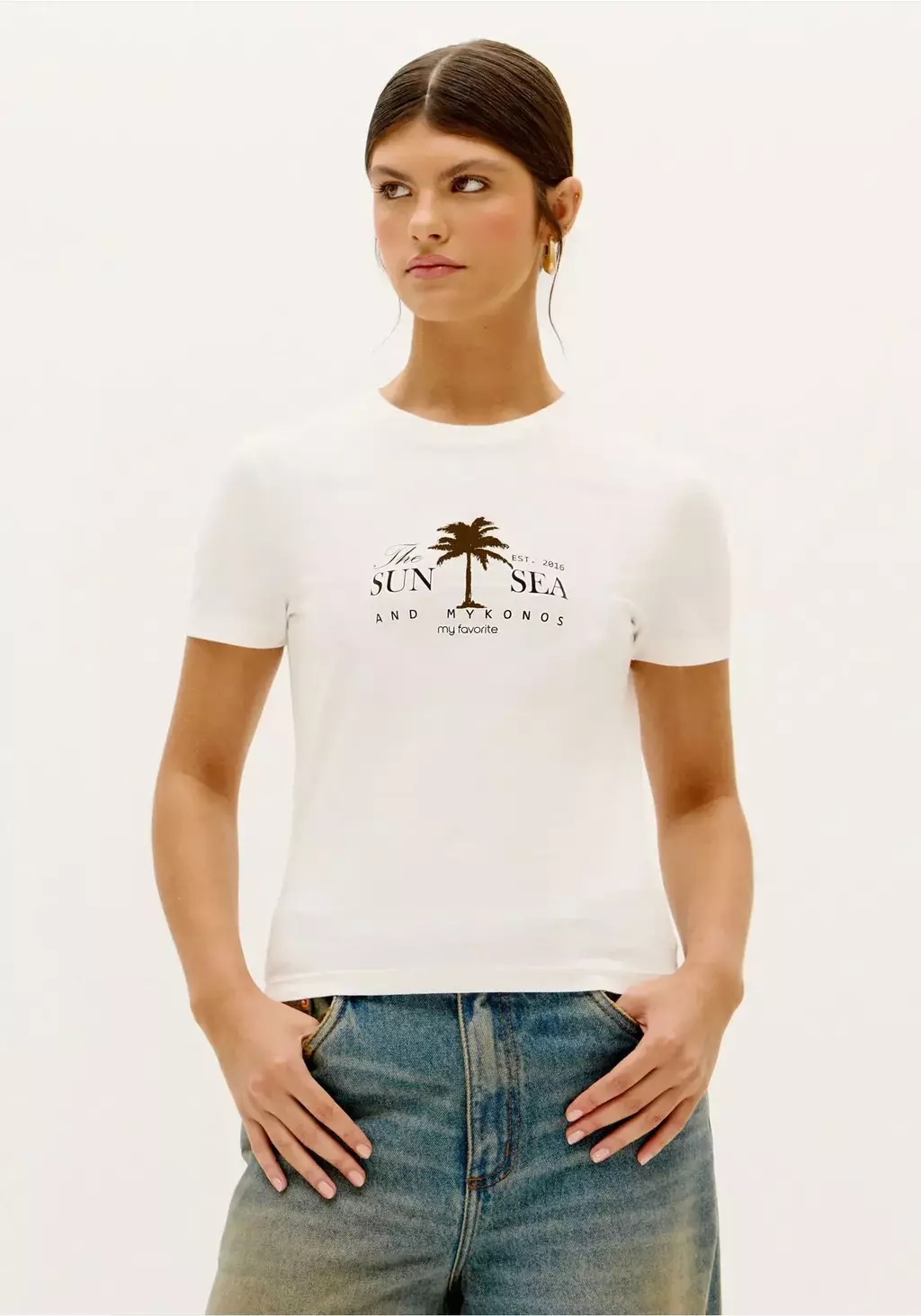 Com inspiração no verão europeu, a t-shirt baby look ganha força no street style. Em modelagem levemente ajustada, manga curta e estampa que traduz frescor e personalidade, é perfeita para produções cool e descomplicadas.